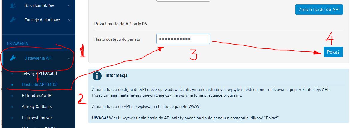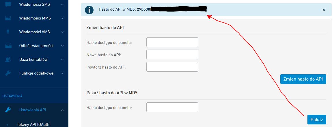 2. Hasło - jest to hasło kodowane w MD5, które pozwala w bezpieczny sposób łączyć się z API portalu i wysyłać wiadomości.
