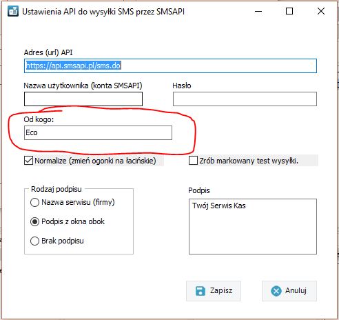 Domyślnie Serwisant przygotowany jest do wysyłania wiadomości typu Eco czyli z losowego numeru z puli posiadanych przez portal SMSAPI.