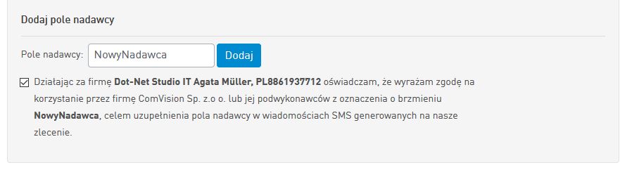 2. Poniżej "Dodaj pole nadawcy" w oknie "Pole nadawcy:" wpisujemy etykietę naszego nadawcy i naciskamy "Dodaj".